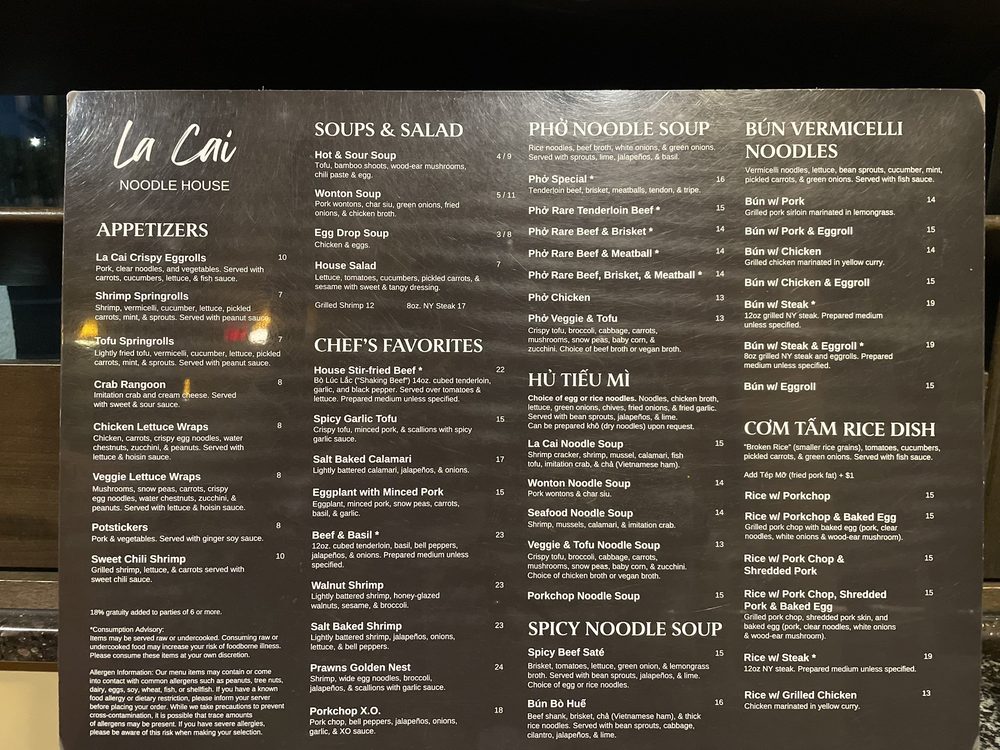 La Cai Noodle House offers a fusion of Vietnamese and Chinese cuisine in Salt Lake City. With a variety of vegan and vegetarian options, this Asian-owned restaurant caters to a diverse palate. Customers rave about the delicious steak and basil dish, flavorful pho brisket, crispy egg rolls, and mouth-watering crab Rangoon. The ambiance is elegant and comfortable, with semi-private booths for a personalized dining experience. Fast and friendly service, quality food packaging for takeout, and a menu offering a mix of sweet and salty flavors make La Cai Noodle House a must-visit spot for lunch or dinner. Whether you're a fan of traditional Vietnamese bun or crave Chinese flat noodles, this gem of a restaurant will leave you coming back for more.